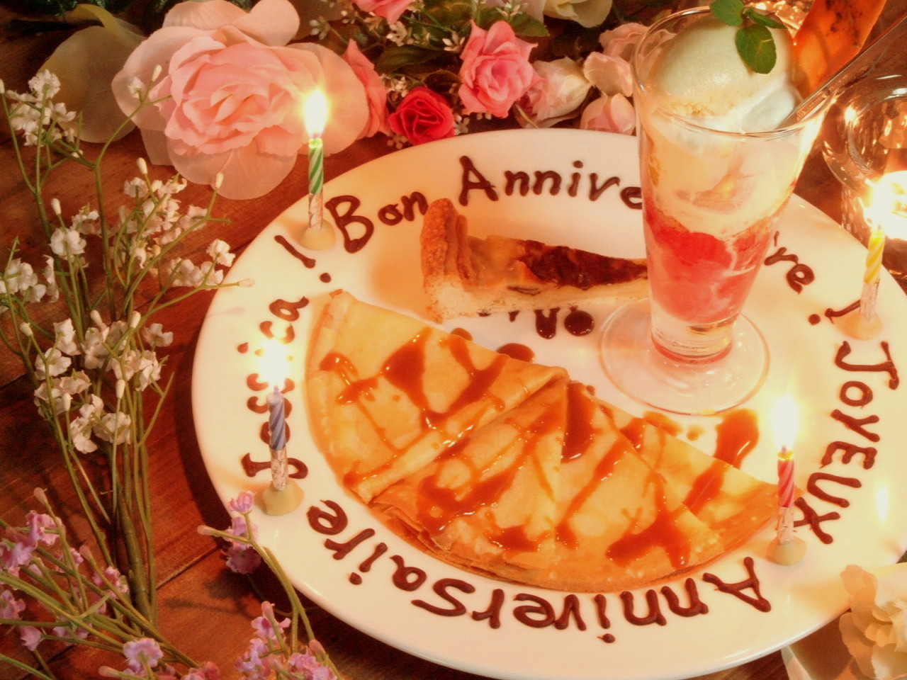 誕生日プレート♪繊細なデザートと、女子には嬉しいフランス語でのメッセージ付☆
